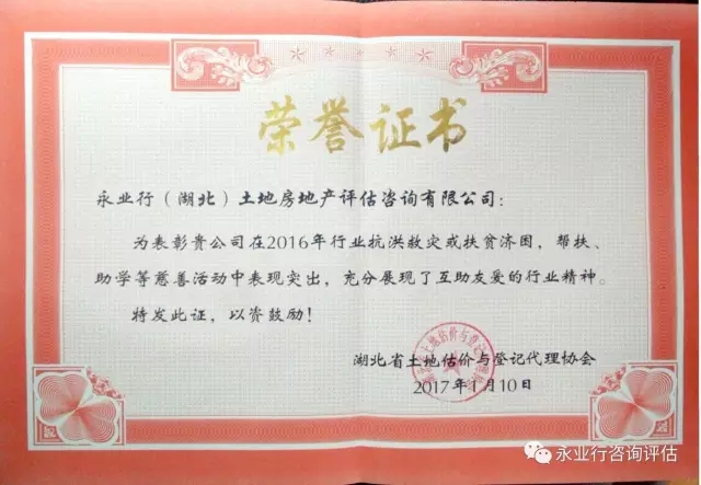 1月10日,湖北省土地估價與登記代理協(xié)會三屆七次理事會暨2017年新年年會在紫陽湖賓館舉行。會上,永業(yè)行獲評“湖北省土地評估行業(yè)慈善活動先進單位”,并頒發(fā)了榮譽證書。