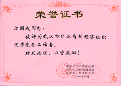 2011年6月,黨委書記方國成同志被評為武漢市非公有制經濟組織優秀黨務工作者
