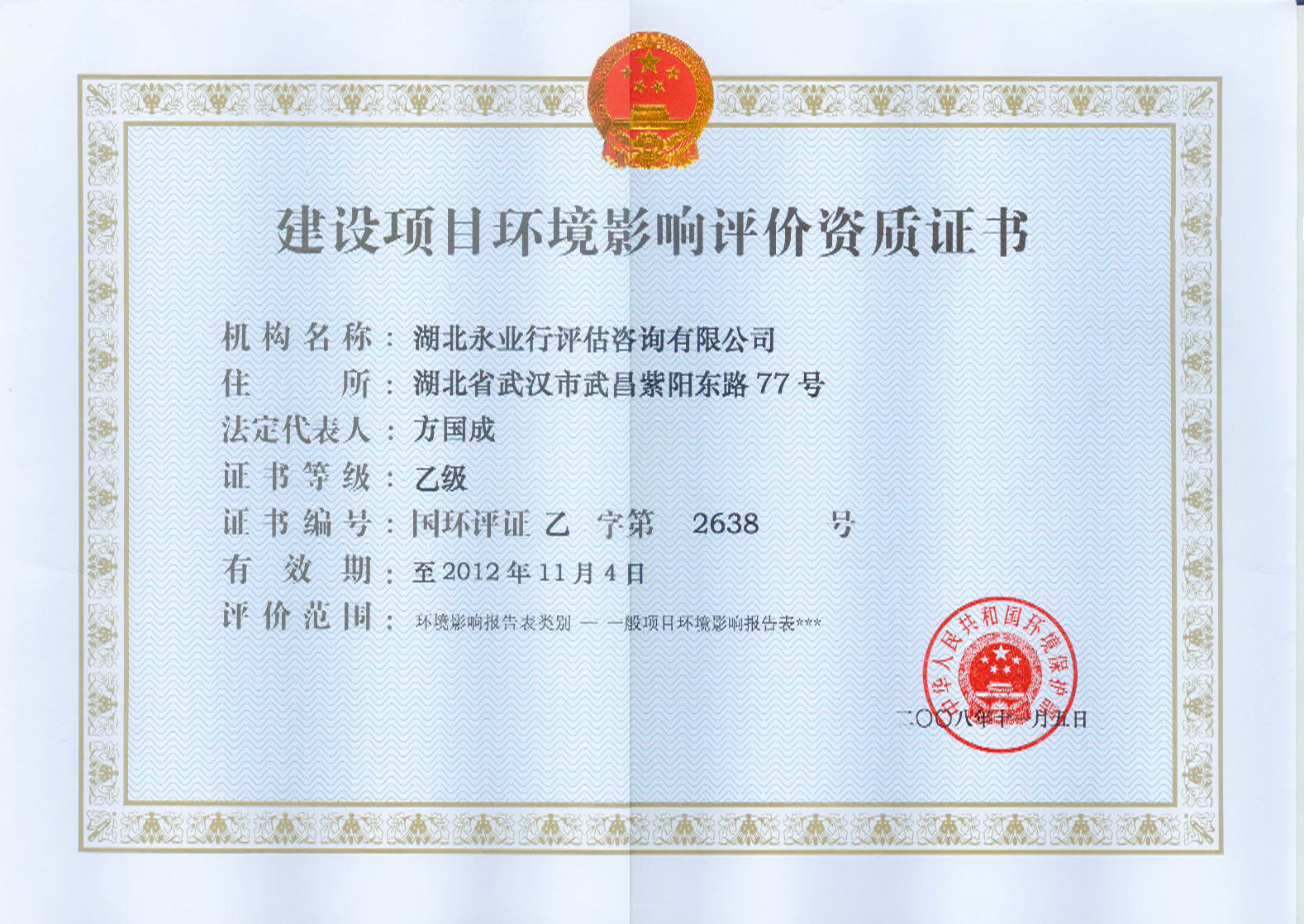 近日,永業行取得了由環境保護部頒發的乙級建設項目環境影響評價資質證,證書編號為國環評證乙字第2638號。自此,永業行可獨立為客戶提供建設項目環境影響評價業務服務。在此之前,永業行曾與其他機構合作完成多項環境影響評價項目。