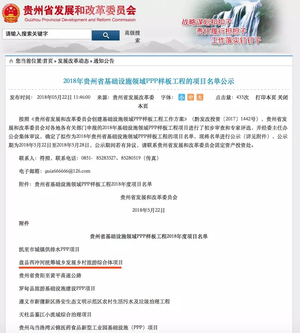 近日,貴州省發展和改革委員會公布了2018年貴州省基礎設施領域PPP樣板工程項目名單,永業行貴州分公司提供全過程咨詢服務的項目——盤縣西沖河統籌城鄉發展鄉村旅游綜合體項目成功入選,本項目將獲得獎補資金500萬元。