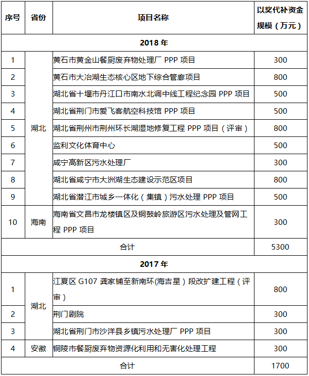 近日,中央財政下達2018年普惠金融發展專項資金120億元,其中PPP項目以獎代補資金23億元,共有383個新建項目以及11個存量項目獲得了該項獎補資金。湖北省有41個PPP項目獲得共計2.34億元獎補資金,獲獎項目數量和金額均位列全國第一。2017年財政部撥付普惠金融發展專項資金116億元,其中PPP項目以獎代補資金18億元(含湖北省12個PPP項目共0.9億元資金)。