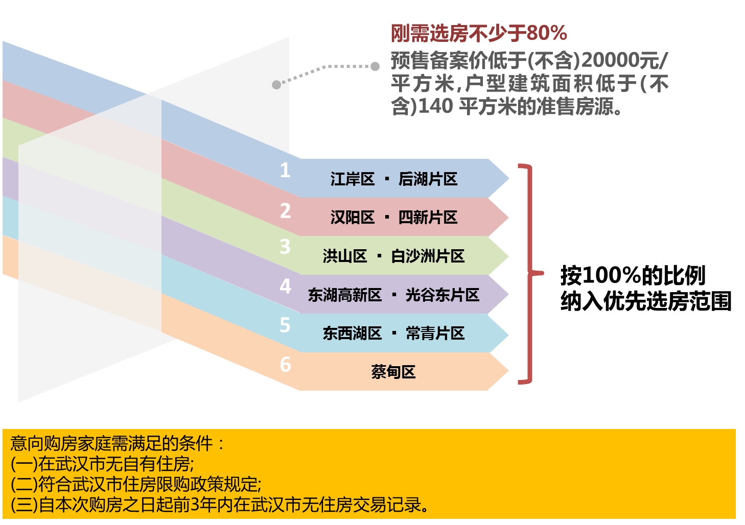 為進一步加強房地產市場分類調控工作,堅持“房住不炒”的定位,武漢市房管局針對剛需無房家庭首次購買新建商品住房操作規程進行了修訂,并正式發布了相應細則。從2018年11月15日起,武漢市備案均價20000元/平方米以內、面積140平方米以下新建商品住宅項目,剛需家庭優先選房房源比例將不低于80%,洪山區白沙洲片、漢陽四新、東湖高新的關谷東等重點區域比例則將提高至100%。