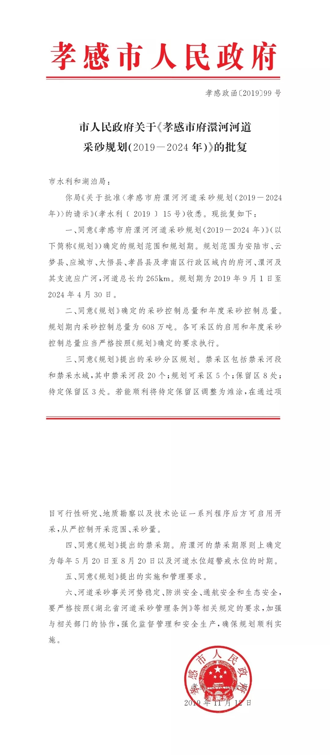 永業行承擔的孝感市府澴河河道采砂規劃通過孝感市政府批復
