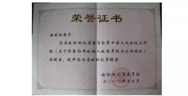 2008年1月,潘世炳參加了政協湖北省第十屆委員會第一次會議,首次參政議政,潘世炳就提交了5個提案。其中,他提出的房產證、土地證“兩證合一”方案,和老百姓關系最為密切,“把房地產所有權證和土地使用權證合在一起,發一個房地產證。當時提案提了以后,主辦方很重視,搞試點,不斷推廣不斷完善,再過了7、8年以后就全部發證了。老百姓辦證很方便,就不用跑兩個部門,也不用花兩道費。”