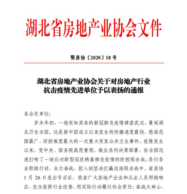 6月5日,湖北省房地產業協會發布通報,對全省房地產行業各類企業作出的突出貢獻予以表彰,永業行獲評抗擊疫情先進單位。