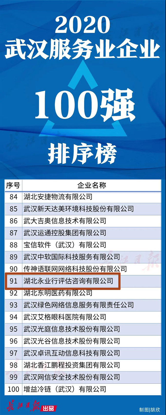 2020年9月25日,2020武漢企業100強、武漢制造業企業100強、武漢服務業企業100強正式發布,永業行憑借良好的發展態勢和經營業績,上榜2020武漢服務業企業百強榜單,這是繼2018年、2019年獲得“武漢服務業企業100強”后,永業行又一次獲此殊榮。