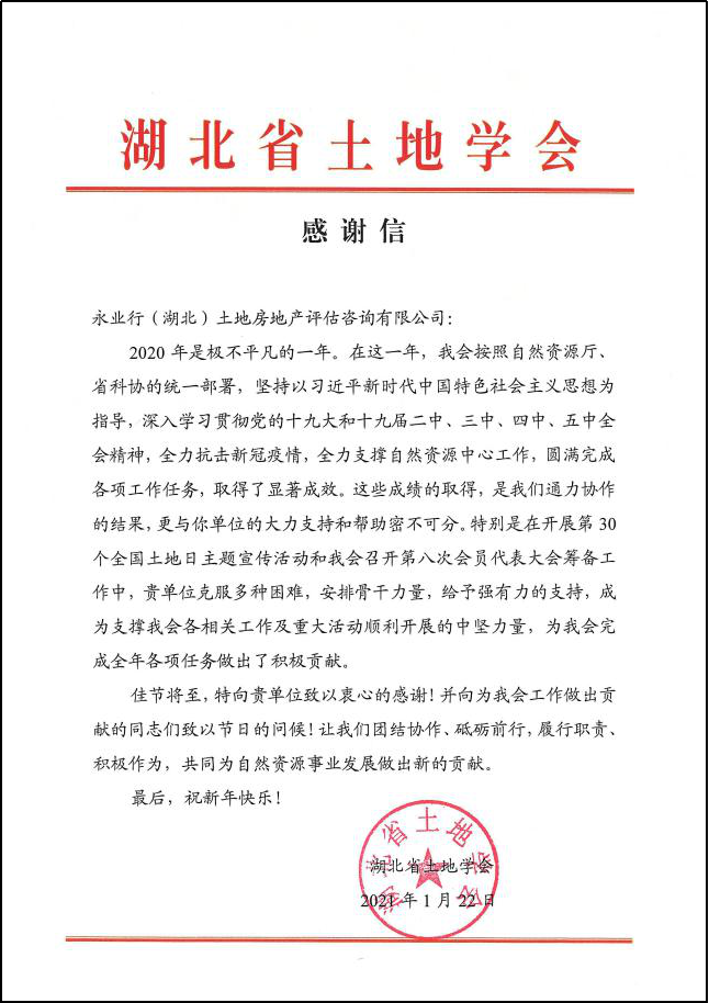 2020年是極不平凡的一年,在這一年里,永業行全力抗擊新冠疫情,積極配合湖北省土地學會各項工作,助力自然資源事業發展,受到湖北省土地學會的積極肯定,于2021年1月收到湖北省土地學會發來的感謝信。