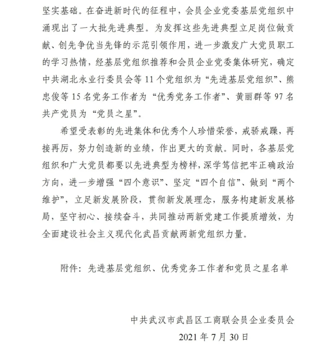 在慶祝黨的百年華誕之際,7月30日,中共武漢市武昌區(qū)工商聯(lián)會員企業(yè)委員會發(fā)文(武昌聯(lián)企黨字〔2021〕14 號),對會員企業(yè)先進基層黨組織、優(yōu)秀黨務工作者和黨員之星進行表彰,永業(yè)行黨委獲評“先進基層黨組織”,周小川等20名黨員獲評“黨員之星”。