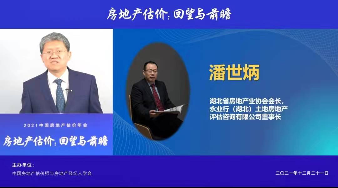 2021年12月21日,中國房地產估價師與房地產經紀人學會(以下簡稱“中房學”)在北京召開中國房地產估價年會。根據當前疫情防控要求,本次會議以線上方式舉辦。中房學會長柴強、中國社會科學院房地產金融研究中心主任尹中立等專家學者及行業領袖共聚一堂,回顧行業發展邏輯與趨勢,探索未來轉型升級新路徑。中房學副會長、湖北省房地產業協會會長、永業行董事長潘世炳受邀發表《新發展階段房地產估價行業創新發展》的主題演講。