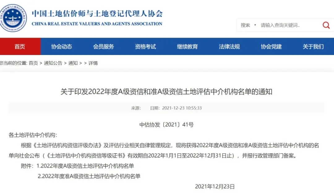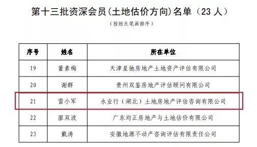 2021年12月23日, 中國土地估價(jià)師與土地登記代理人協(xié)會(下稱“中估協(xié)”)發(fā)布“2022年度A級資信土地評估中介機(jī)構(gòu)”名單,在全國120家A級資信機(jī)構(gòu)中,永業(yè)行位列全國第四、湖北第一,連續(xù)14年獲評“A級資信土地評估機(jī)構(gòu)”。中估協(xié)同時(shí)公布了第十三批資深會員名單,副總裁雷小軍榮獲土地估價(jià)方向資深會員榮譽(yù)。