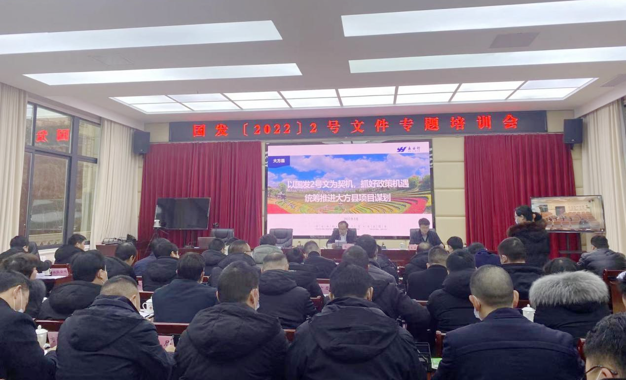 2022年2月24日,永業(yè)行副總裁文云波應(yīng)邀為大方縣作“以國發(fā)2號文為契機(jī),抓好政策機(jī)遇,統(tǒng)籌推進(jìn)大方縣項目謀劃”專題交流培訓(xùn)。大方縣委常委、常務(wù)副縣長張銘出席并主持會議。