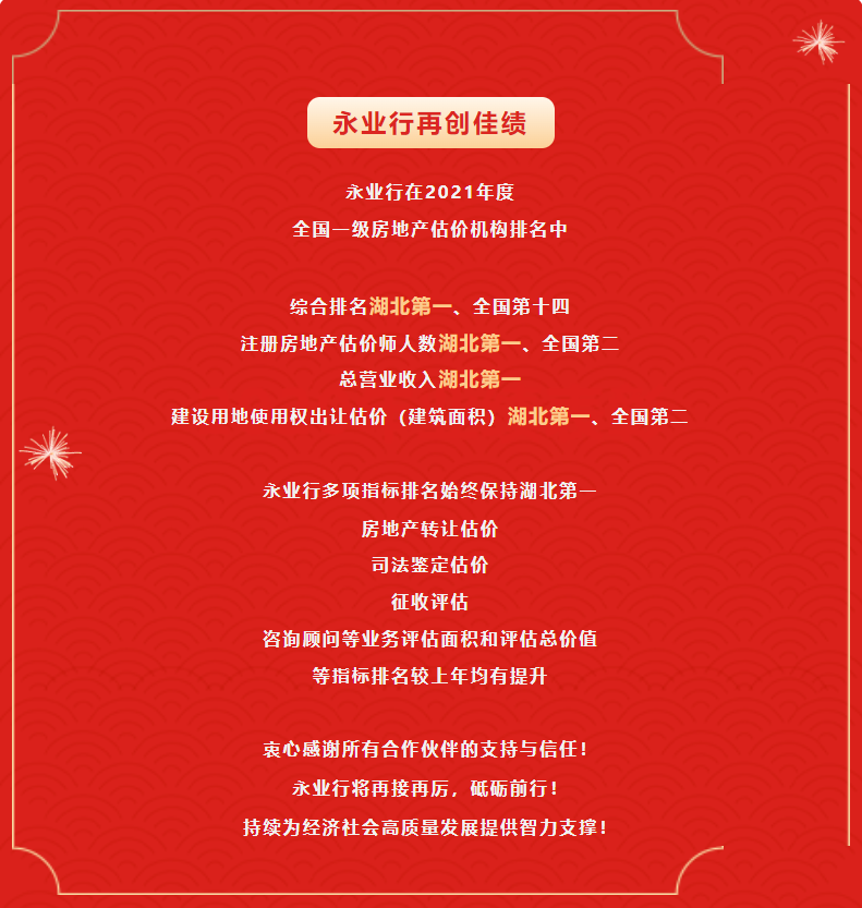 在綜合排名中,永業行綜合排名湖北第一、全國第十四,估價機構注冊房地產估價師人數湖北第一、全國第二,總營業收入湖北第一、全國第三十二,建設用地使用權出讓估價(建筑面積)湖北第一、全國第二,房地產轉讓估價、司法鑒定估價、征收評估、咨詢顧問等業務的評估面積和評估總價值等指標排名較上年均有大幅提升。