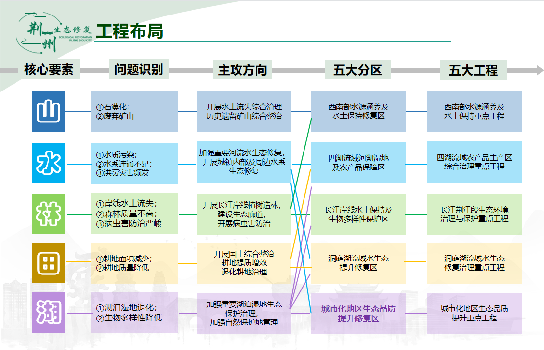 《規劃》以“山”、“水”、“林”、“田”、“湖”為有機整體,構建人與自然和諧發展的生態修復安全格局,從根本上解決荊州地區生態系統服務功能退化的趨勢,使荊州生態環境質量得到總體改善,生態系統服務功能穩定提高,生態系統穩步健康發展。