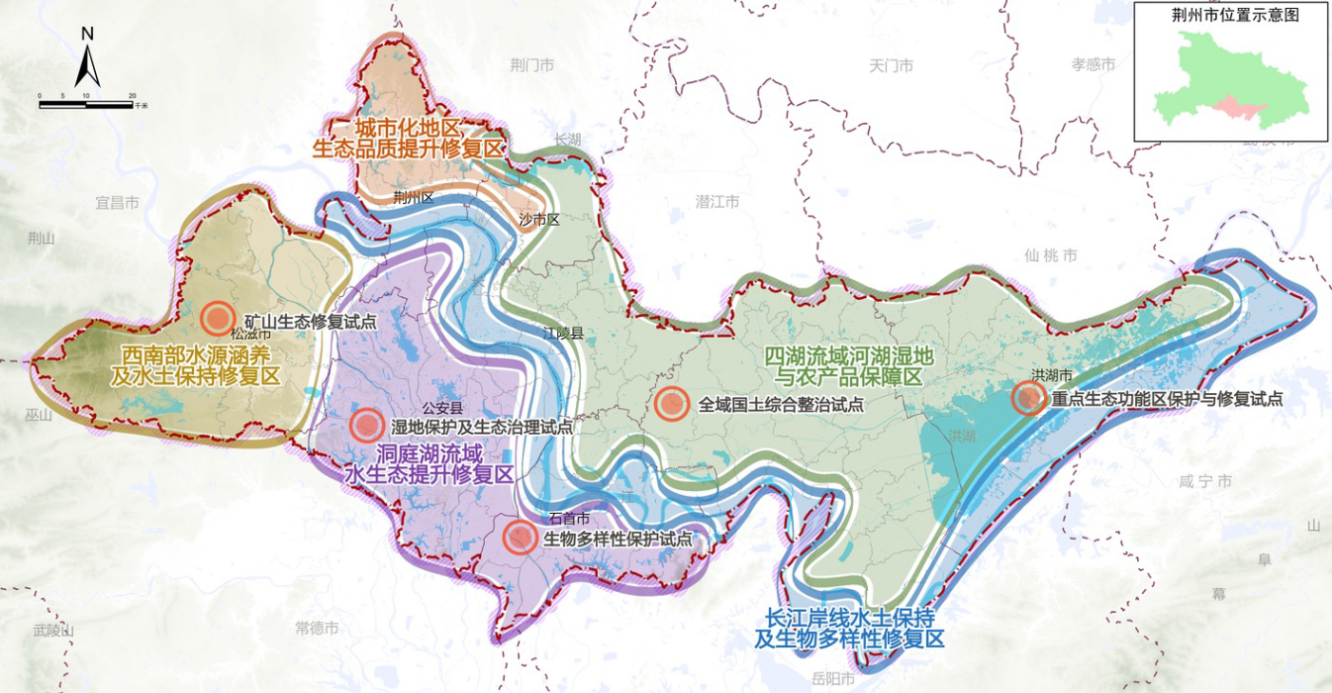 《荊州市國土空間生態修復規劃(2021-2035年)》(以下簡稱《規劃》)是《荊州市國土空間總體規劃(2021-2035年)》的重要專項規劃,是對《湖北省國土空間生態修復規劃(2021-2035年)》的進一步落實和傳導。《規劃》積極踐行習近平生態文明理念,全面梳理全市生態資源本底及問題,科學確立國土空間生態修復目標,構建市域生態修復格局,劃分國土空間生態修復分區,提出國土空間生態修復重點區域并部署重點工程,從生態系統整體性和流域系統性出發,筑牢生態安全格局,支撐荊州市經濟社會綠色高質量、科學可持續發展。