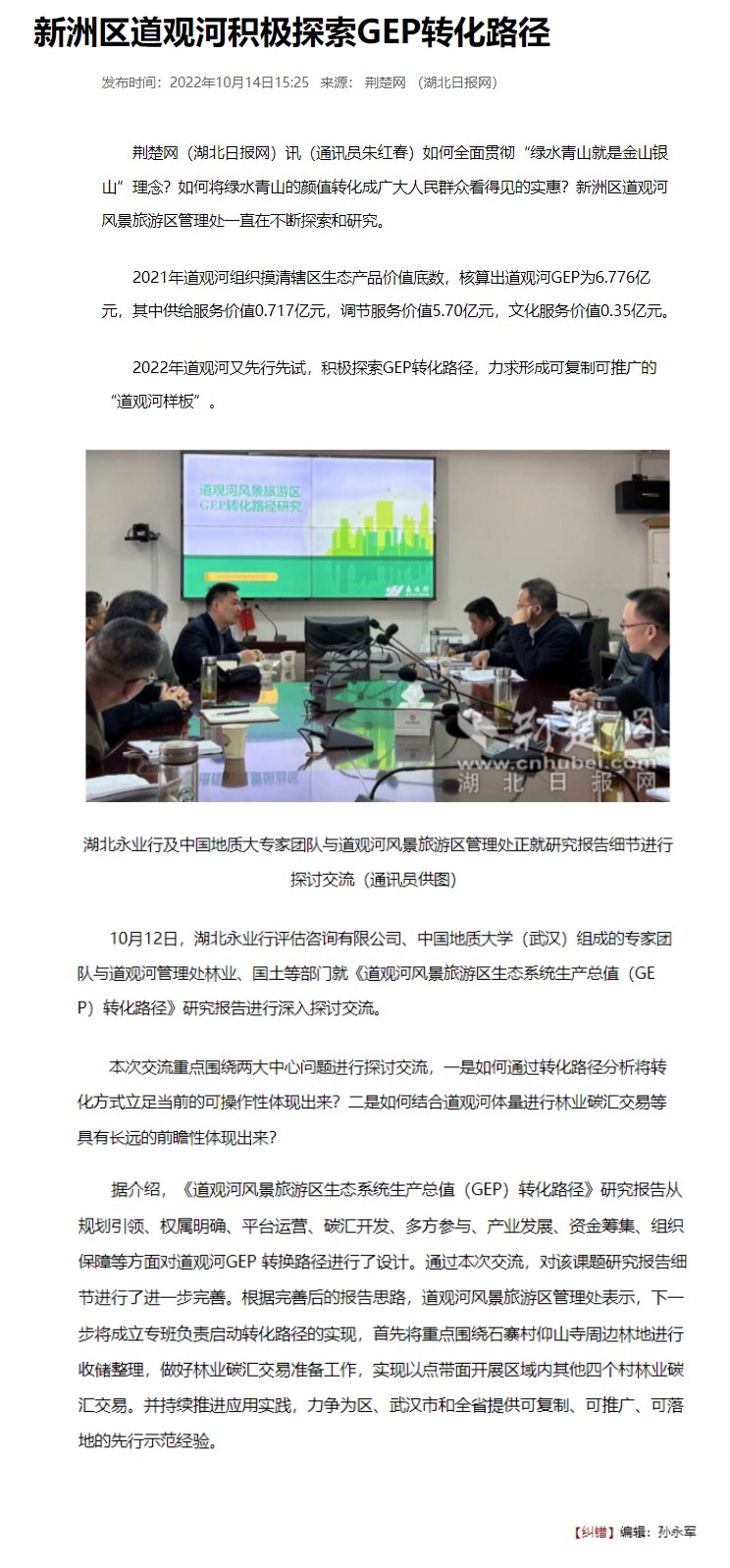 10月14日,荊楚網對永業行承擔的《道觀河風景旅游區生態系統生產總值(GEP)轉化路徑研究》項目進行報道。永業行碳中和研究中心項目組代表與道觀河風景旅游區管理處林業、自然資源等部門就道觀河風景旅游區GEP轉化內容進行了深入交流與探討。中國地質大學(武漢)作為道觀河風景旅游區GEP核算單位出席座談。