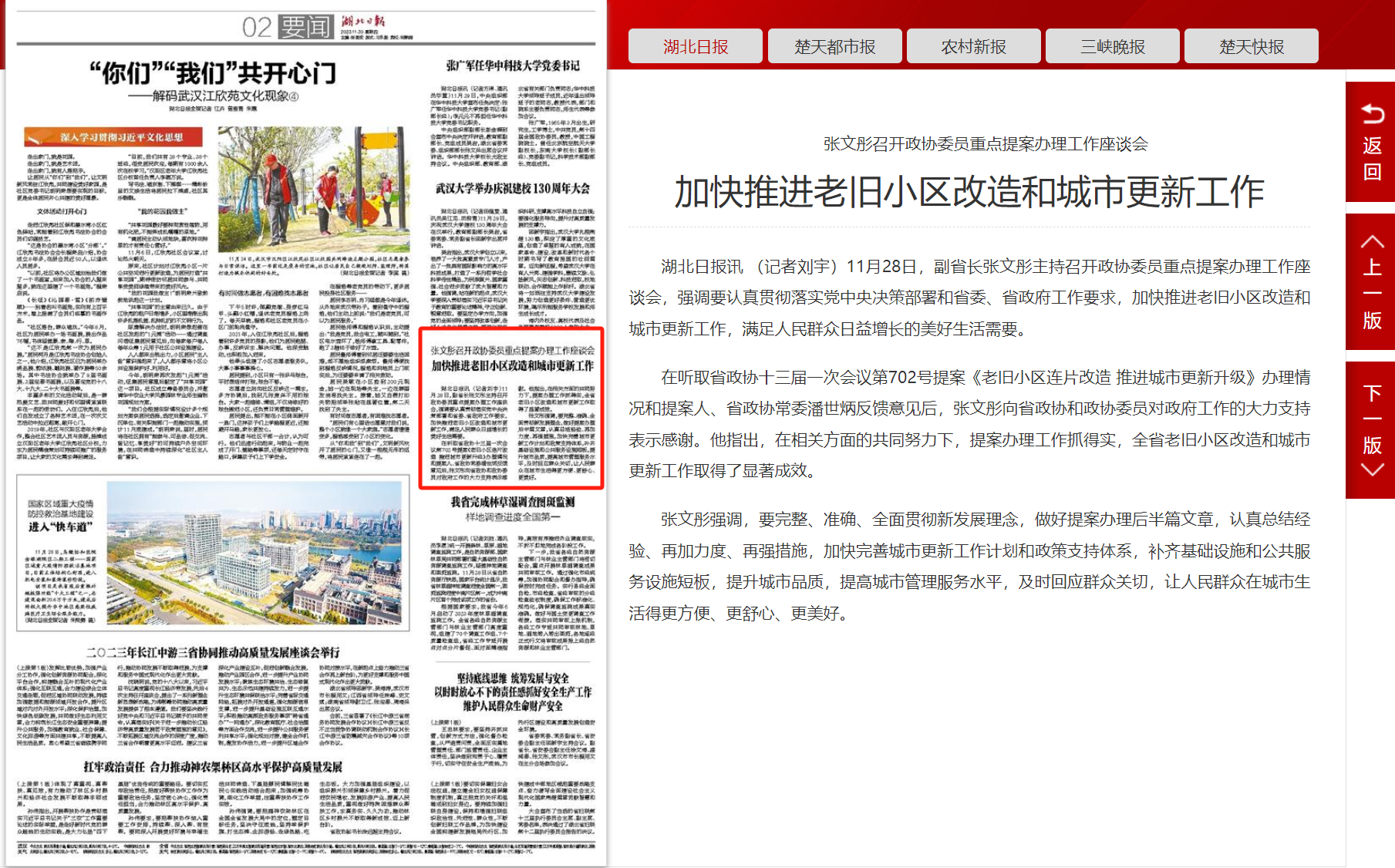 湖北日報訊 (記者劉宇)11月28日,副省長張文彤主持召開政協委員重點提案辦理工作座談會,強調要認真貫徹落實黨中央決策部署和省委、省政府工作要求,加快推進老舊小區改造和城市更新工作,滿足人民群眾日益增長的美好生活需要。