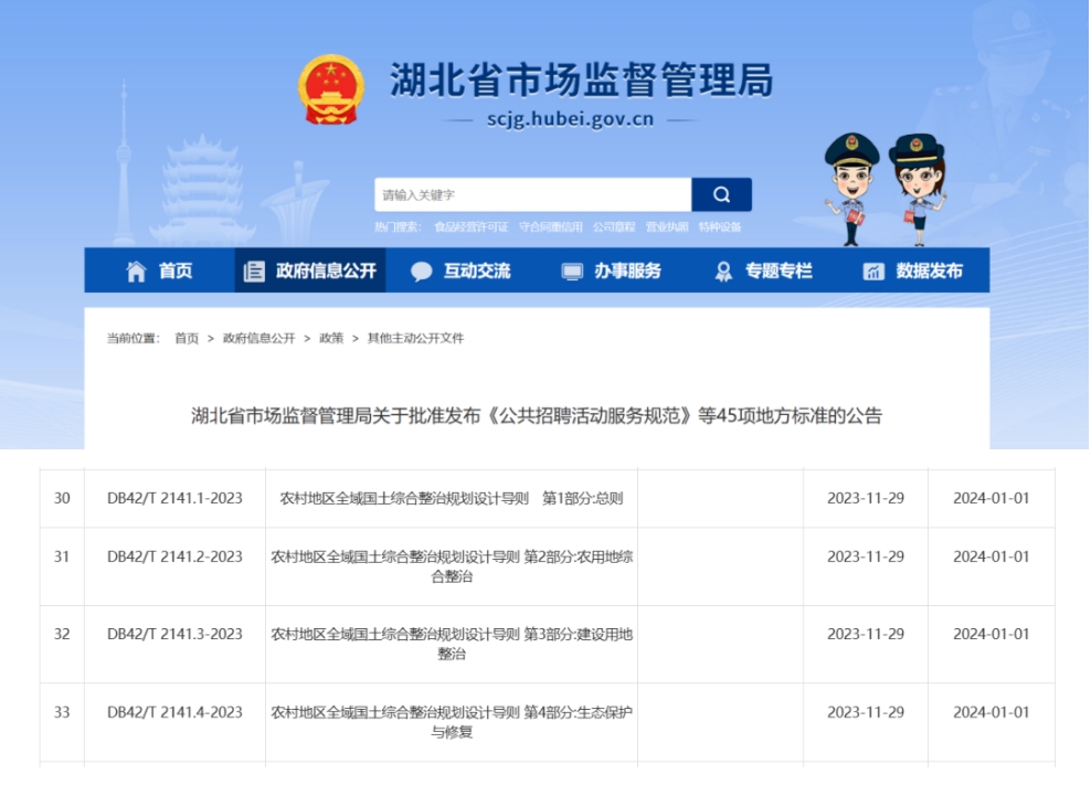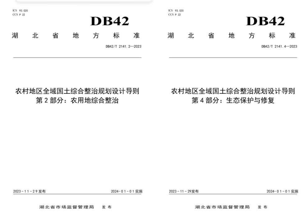 近日,湖北省市場監督管理局發布45項地方標準的公告,永業行參編的《農村地區全域國土綜合整治規劃設計導則 第2部分:農用地綜合整治》(標準號:DB42/T 2141.2-2023)、《農村地區全域國土綜合整治規劃設計導則 第4部分:生態保護與修復》(標準號:DB42/T 2141.4-2023)批準發布。
