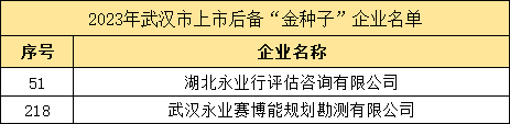 近日,2023年武漢市上市后備“金種子”“銀種子”企業(yè)名單公布,其中湖北永業(yè)行評(píng)估咨詢(xún)有限公司、武漢永業(yè)賽博能規(guī)劃勘測(cè)有限公司再次成功入選上市后備“金種子”企業(yè)。