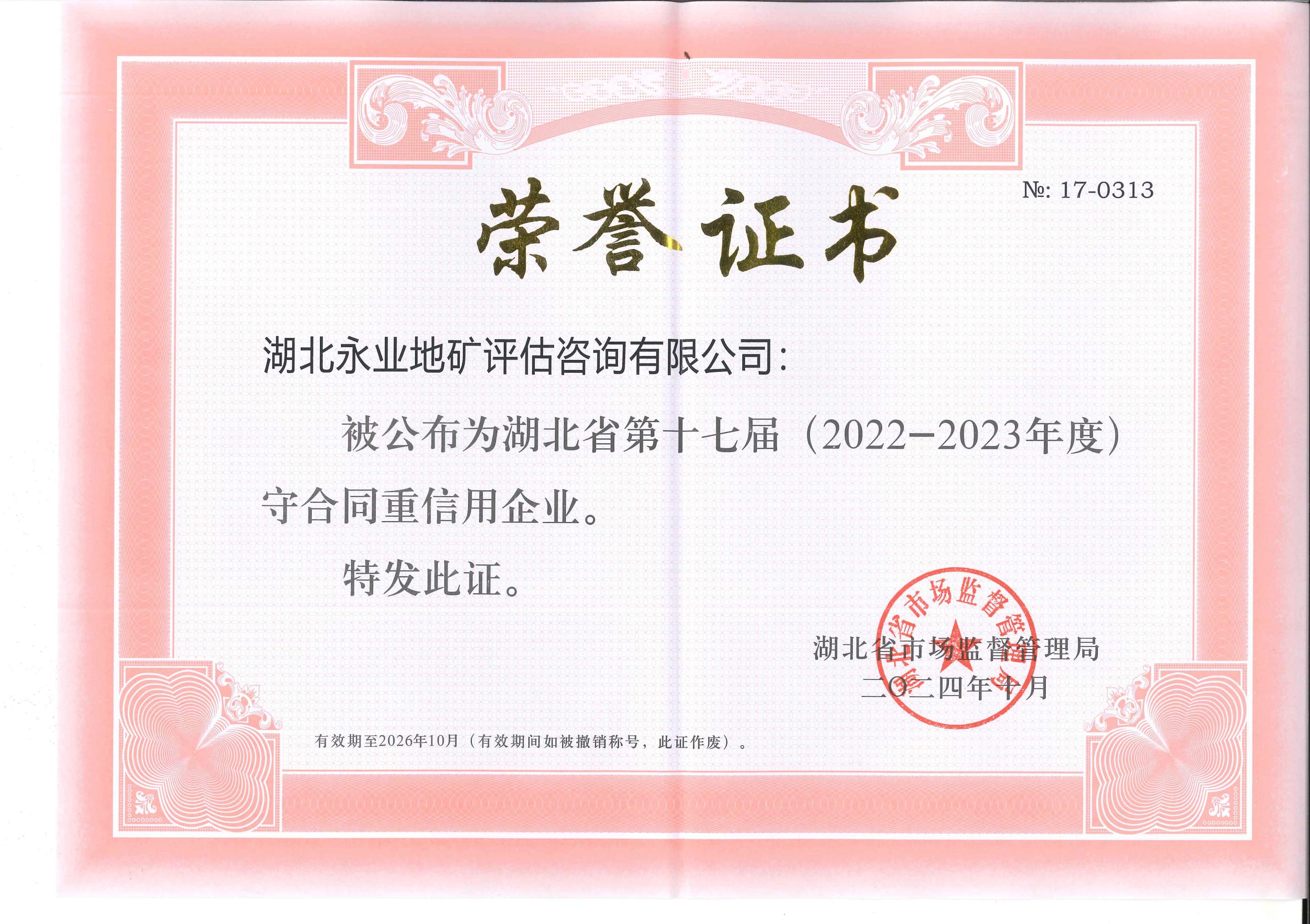 2024年10月21日,湖北省市場監(jiān)督管理局公布了湖北省第十七屆 (2022—2023年度)“守合同重信用”企業(yè)名單。成員機(jī)構(gòu)湖北永業(yè)地礦評估咨詢有限公司、永業(yè)行工程項目管理有限公司榜上有名,連續(xù)十三年獲評湖北省“守合同重信用企業(yè)”。