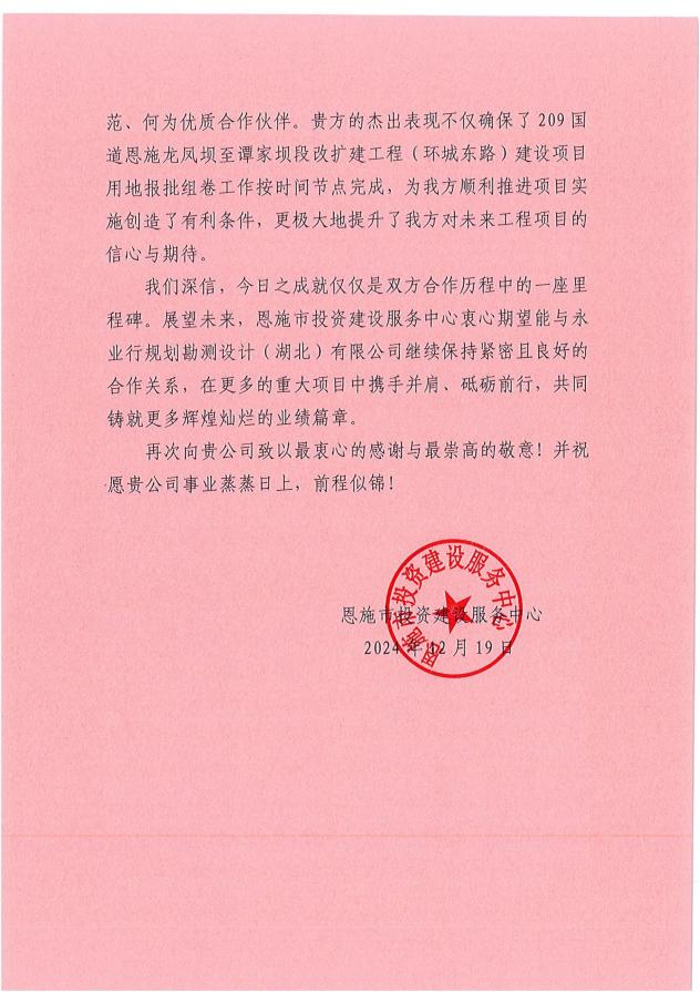 感謝信中對永業行鄂西區承擔209國道恩施龍鳳壩至譚家壩段改擴建工程(環城東路)表達了充分的感謝,贊許了項目團隊(肖澤元、何海軍)在面臨土地報批時遇到時間緊、任務重、技術難度大等問題時,始終堅守崗位、兢兢業業,為搶抓節點窗口,主動放棄休假,日夜奮戰崗位一線,展現出無與倫比的敬業精神和高效協作能力,團隊內部以及與各方之間的溝通協調順暢無阻,信息傳遞及時準確,確保了問題在第一時間得到妥善處理,大大提高了工作效率,最終確保項目用地報批組卷工作按時完成,為項目的順利實施創造了有利條件。