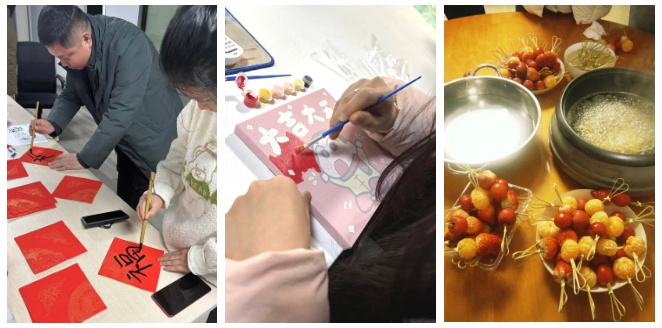 祥龍辭歲福澤滿,金蛇迎春瑞氣盈。大家坐在一起分享生日蛋糕,畫著飽含新年祝福的數(shù)字油畫,玩“狼人殺”“不要做”挑戰(zhàn)等小游戲;大家親手熬糖、掛糖,制作了一串串晶瑩剔透、紅亮誘人的水果冰糖葫蘆,瞬間勾起心底最溫暖的兒時(shí)回憶。活動(dòng)現(xiàn)場節(jié)日氛圍濃厚,甜蜜與歡樂同行,咸寧分部全體員工感受到了“大家庭”的溫暖。