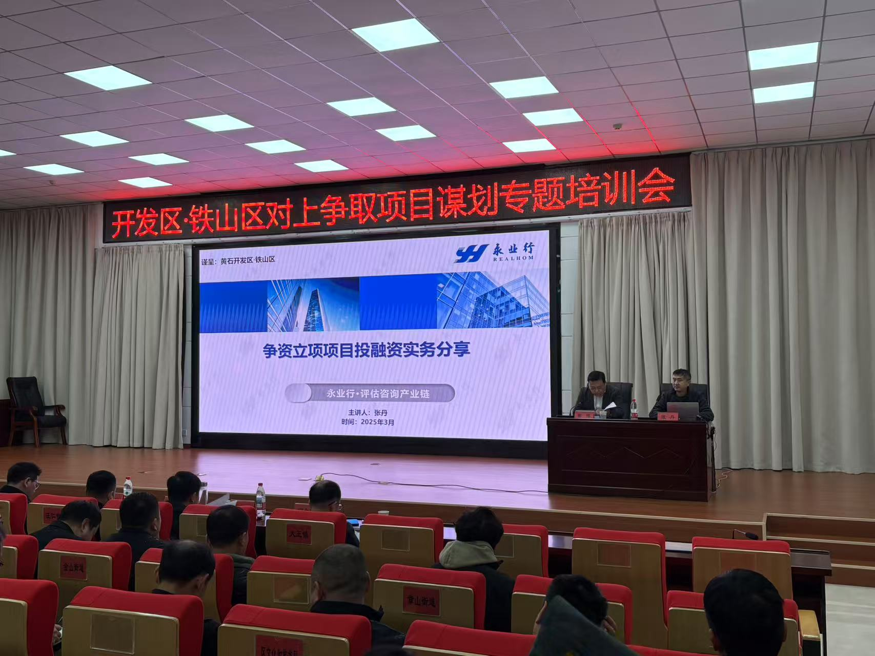 2025年3月14日,黃石經濟技術開發區·鐵山區舉辦對上爭取項目謀劃專題培訓會,開發區黨工委副書記、鐵山區區長余文化出席會議,常務副區長龔暉主持并作總結講話。永業行聯席總裁王琴帶領技術團隊參加培訓,財稅評估咨詢事業部技術中心總經理張丹應邀作“爭資立項項目投融資實務分享”。