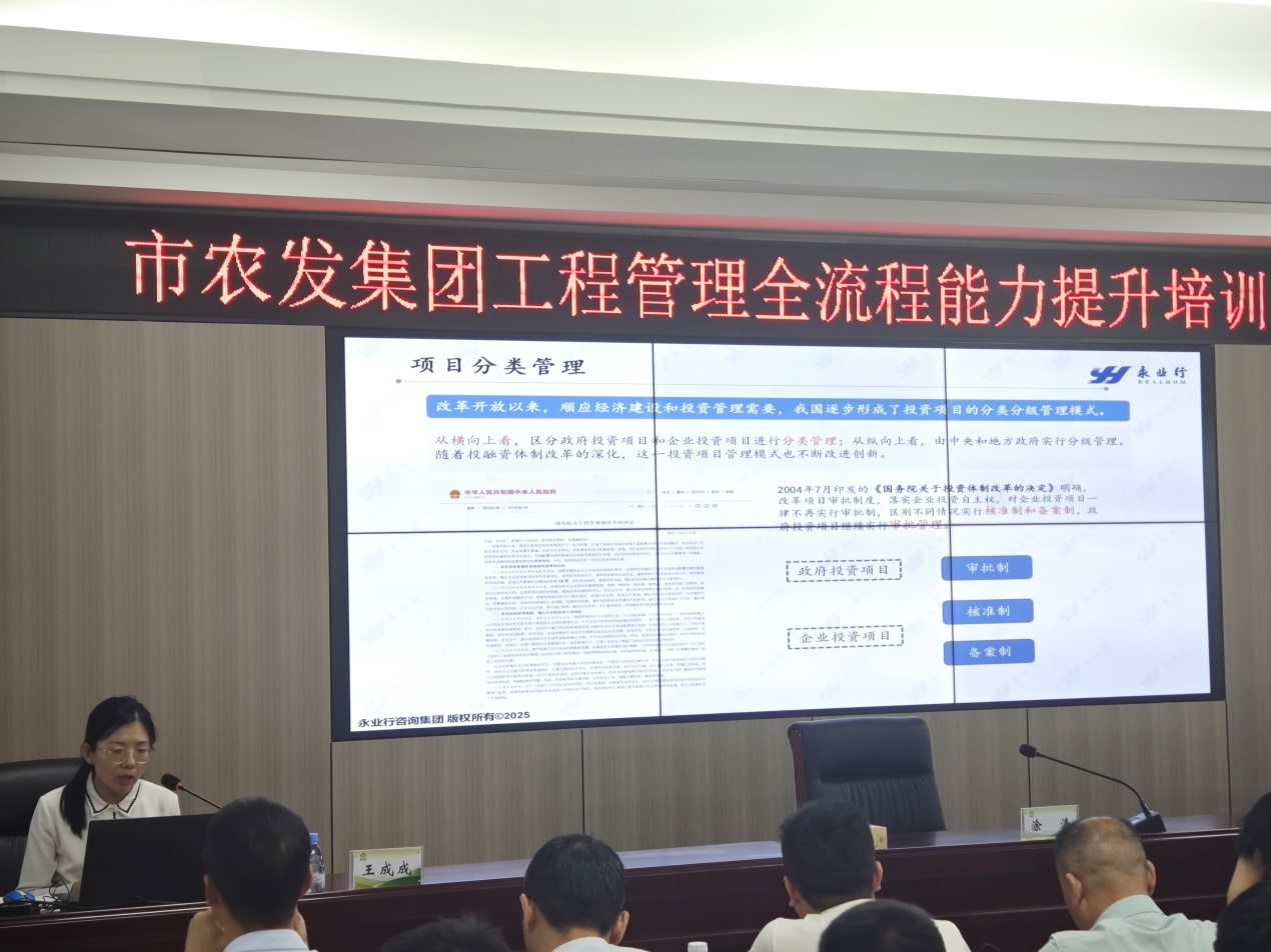 2025年5月12日,潛江市農業發展集團有限公司組織召開“市農發集團工程管理全流程能力提升培訓會”,市農發集團副總經理涂濤主持會議。永業行投資金融事業群工程咨詢事業部總監王成成受邀作《建設項目全流程管理》專題培訓。