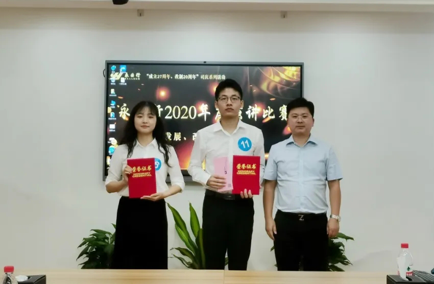 值此永業(yè)行“成立27周年、改制20周年”之際,為充分展示“永業(yè)行人”的精神風(fēng)貌,激發(fā)廣大員工愛崗、敬業(yè)、奉獻(xiàn)的熱情,8月28日,永業(yè)行2020年度“發(fā)展、改革、創(chuàng)新”主題演講比賽正式拉開帷幕,來自總、分部的18名青年員工參加比賽,董事長、總裁潘世炳,副總裁雷小軍、靳劍輝、劉曉峰,業(yè)務(wù)部門負(fù)責(zé)人代表,2019年度永業(yè)行標(biāo)兵及先進(jìn)工作者代表作為評委出席比賽。