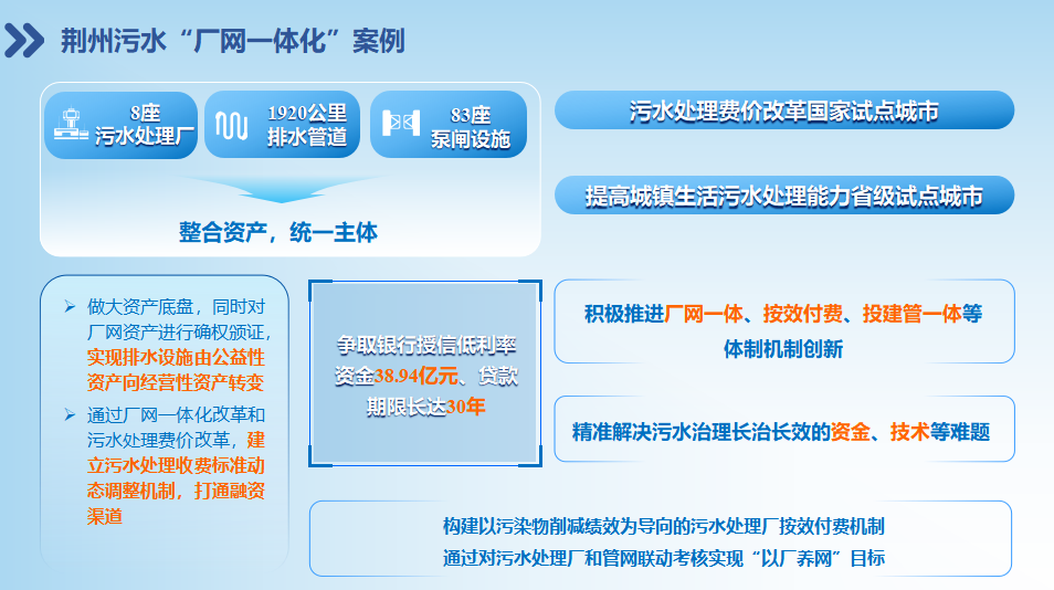 2022年起,針對地下管網老舊、管理權屬不清、廠網運營管理分散等問題,我省打響了“管網攻堅戰”。永業行以污水處理價格改革、按效付費機制構建等頂層設計為切入點,協助各級政府及主管部門積極探索,逐一破解廠網資產歸集、管網確權、確值入賬、模式創新、投建營一體等堵點難點;走出了“廠網一體+使用者付費+按效付費”的長效治污新路子,實現了廠網資源資產化、授權授信資金化、投建管運一體化、整體運行市場化;系統解決了以往城鎮排水設施建管分離、責任不清、運維質效低下、資金籌措渠道不暢等問題。2025年8月,荊州市不動產登記中心發出了全省第一張管網不動產登記證書,有力推動了管網價值“無形變有形”,助力實施主體成功爭取了政策性銀行“長周期、低利率”融資授信。
